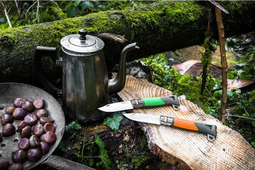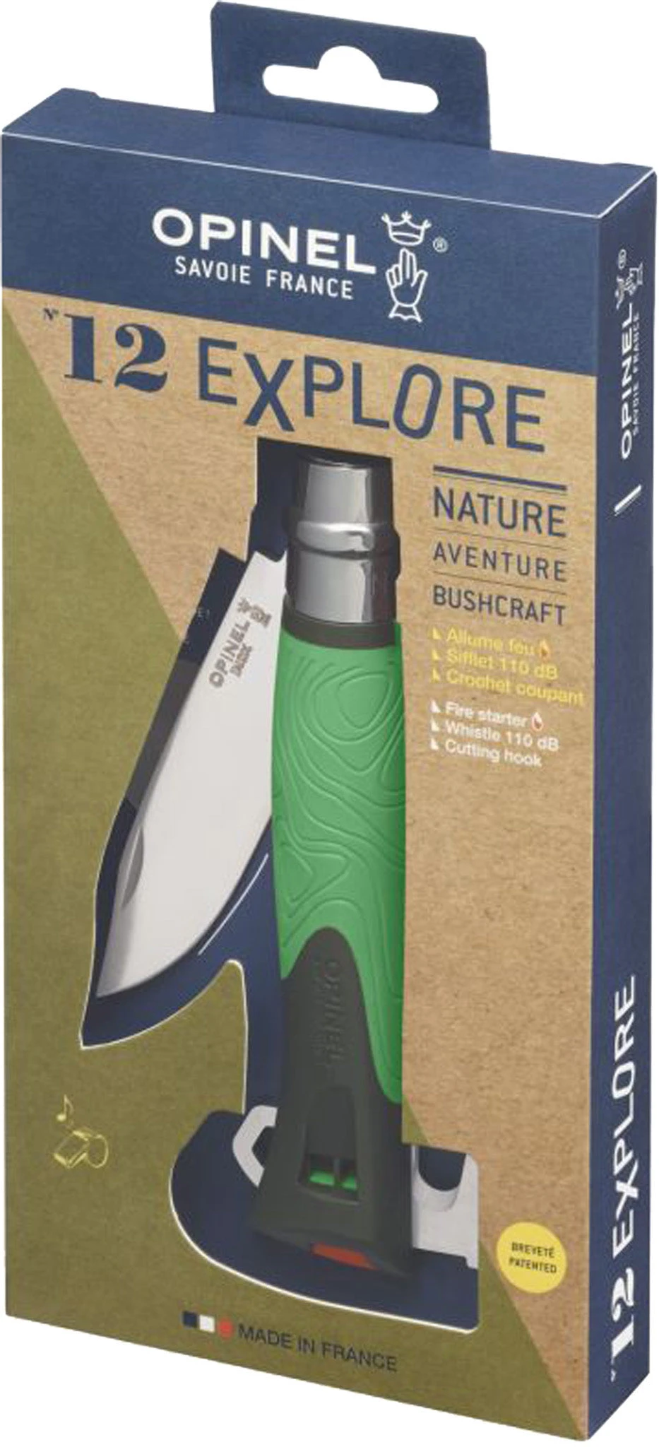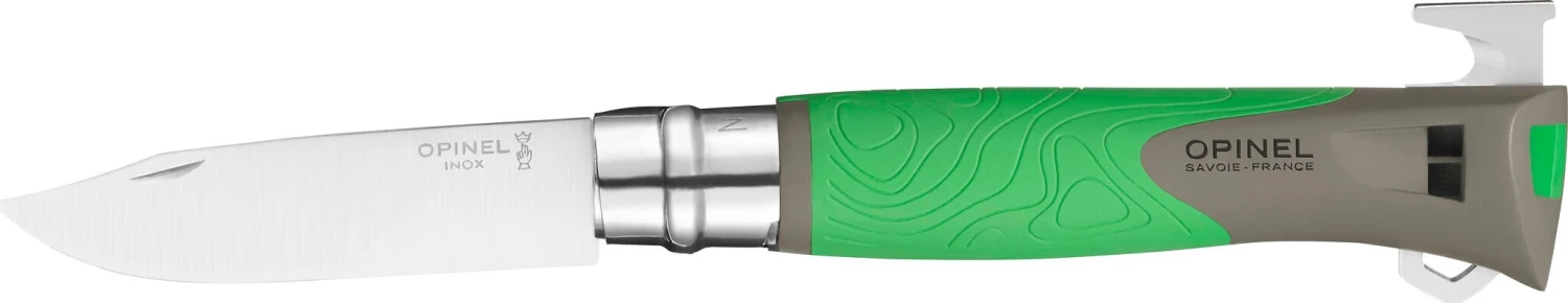 • Safety ring:Invented by Marcel Opinel in 1955, the Virobloc safety ring is fitted to all folding knives from the N° 06. Cut out of stainless steel, the Virobloc has two sections, one fixed and one sliding. In addition to locking the blade open (safety in use), it is now possible to lock the blade closed (safety in transport).|-|A la fois couteau de chasse et couteau de survie, le N°12 Explore, avec sa lame courte et robuste assure une coupe précise.