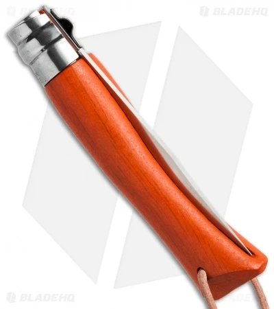 This traditional Opinel #7 Trekking folder has a stainless steel clip point blade and tangerine beech wood handle with a leather lace lanyard. Includes the Virobloc safety ring that locks the blade in the open and closed positions. This traditional Opinel pocket knife is lightweight and inexpensive while displaying simple sophistication.